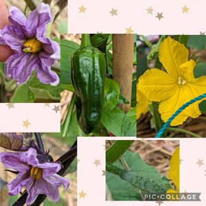①② 今日のお花 キュウリ ③④ 万願寺とうがらし ⑤ 白ナスの花 他にも紫のナス、ピーマン、ミニトマト、大葉も食べています😋