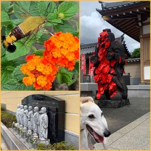 今日の散歩🐕🐾 TV📺純散歩で東覚寺赤札仁王やってましたね 阿像、吽像疫病を静めるだめ建立されたもの。いつの頃からか赤紙を貼って病気身代わりと心身安穏を願うようになったとの事 🧡ランタナ🧡大きな蜂🐝?が オオスカシバのようです