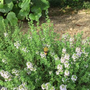 6月2日 タイムな花に来た、ちょっと派手な昆虫。 虫が苦手なので、怯んでしまった。 こんな派手なのは、海外から来た困った虫だと思いましたら、家人が日本の在来種だと。 毎年作る、トマト🍅にたかる虫だと聞いて警戒しなくてはと。 敵は、オオスカシバ(チョウ目スズメガの仲間) 好きな人には、美しいと映るらしい。 スズメガの仲間では、一番透明な羽を持っているそう。 花アブの羽音は気になりませんが、オオスカシバの羽音は不気味でした。 幸いなことに、現在までトマトに被害はありません。