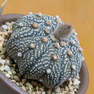こんばんわ。 今日は涼しかったですね、少し。ただこれだけの寒暖差でも体調に影響ありまして、明らかに具合悪かったです汗 飛び地の祝日は基本会社なのですが、電車が部活関係の子供達で沢山でした。全然快適じゃない汗 今日は、アストロフィツム属の兜丸です。こちらも銀冠玉と同じスパンで花芽が上がっています。兜丸の開花は短いよう?で一度しか見れていません。棘のないサボテンは植え替えが楽で良いですよね。毛もカワイイですし、模様もなんともいえないです。小型の兜丸もいたのですが、2体揃って冬の休眠で激萎みしまして、こちらの大きい方は何とか膨らんで助かったのですが、小さい方はシボシボのまま回復しませんでした。黒くはなっていないのでワンチャン水耕で発根できないかなぁと企んでいますが…難しいでしょうね汗