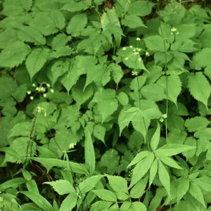 【岳芹】《セリ科》 別名 カノツメソウ 日本固有種です。 根茎の形を鹿の爪に見立ててカノツメソウ(鹿の爪草)の名があります。 セリ科は紛らわしいものが多いですが、 カノツメソウは葉が細かく裂けない2回3出複葉で、比較的見分けやすいです。
