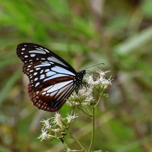 アサギマダラ 浅葱斑 海を渡る蝶 浅葱色をした半透明の美しい羽根 ヒヨドリバナの蜜を吸い食事中 紀伊半島に集結し台湾や香港など暖かい所へ南下する。 葉が無裂のためヒヨドリバナに変更