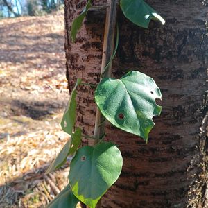 キジョラン(鬼女蘭)キョウチクトウ科(旧分類ではガガイモ科)キジョラン属 つる性の多年草の1種。有毒 「アサギマダラの幼虫がいるよ」と花友さんからラインがきたので山の公園に見に行ってきました。 丸い穴がたくさん開いた小さなキジョランの葉を見つけたら、その葉裏にアサギマダラ幼虫がいるそうです。 いました1匹だけでしたが、確認できました。 無事に越冬してほしいです。 1⃣ 丸い穴ののあいたキジョランの葉 2⃣ 木にツルを絡ませて、かなり大きくなりました。 3⃣ 葉っぱの裏のアサギマダラの幼虫 4⃣ 幼虫アップで。 虫嫌いな方ごめんなさい(_ _;) 5⃣ 来年はこのような蝶々に育ってほしいです。10月22日 鬼女蘭(キジョラン)の葉裏で越冬するアサギマダラの幼虫