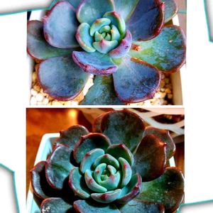 私のお気に入りブルートバーズさん(〃ω〃) 上が秋口の頃ブルートバーズさんらしい爽やかなエメラルドグリーンとピンクのエッジ💖 下は今日のブルートバーズさん 締め上げて葉っぱが立ち上がってます 少し紅葉🍁してますね🎵葉数も増えました どちらも私は好きなtype💖
