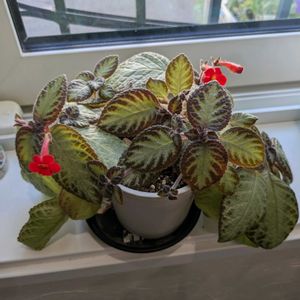 イワタバコ科のエピスシア✨🌿✨ お店でパッと見、レックスベゴニアさんかと思いました。 値段もお手頃価格だったので、葉っぱ好きには見逃せません😁 ピンクの葉っぱが可愛い🩷 赤橙色の小さいけど目立つお花も可愛い❤️ 後でよーく調べたら、寒さには非常に弱い、とありました😲 我が家じゃ、ダメじゃん👎 って感じの葉っぱちゃんですが… ダメになるまで楽しみたいと思ってます😄💕