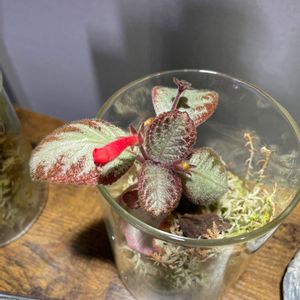 一昨日お迎えしたエピスシア😆 写真ではわかりにくいですがラメが乗ったような葉がお気に入りです。ビロードちっくなのも。 でもアナタもジメジメ系なのね… 密閉されるの好きかしら… ミニ温室に入れてみました。