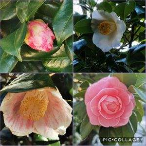 こんばんわ!🍀 四種類の椿🌸 左下↙️の椿、初めて見ました。💗 ふんわりと大きな花でした。💘 名前を知りたいです。ご存知の方、教えてください。 宜しくお願いいたします。🙇