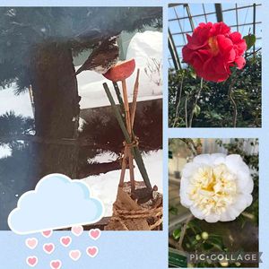 こんばんは〜😃❄️ 昨日と比べてマイナス10度の 寒さ❗️ 風が強かったので積もった雪が 吹き飛ばされていました😰。 風が強くても朝からリンゴ🍎 にツグミ・ムクドリ・ヒヨドリ 🐦がやって来てあっという間に なくなります。 無くなるとギーギー鳴いて🍎を 要求します❗️ 春になると山に戻ったり 渡りして来なくなります。 紅白の椿は百合が原公園の 温室内で📸✨。 どちらも手のひら大で 綺麗✨で珍しい椿ですネ〜💕 ↗️紅は 「ドクタークリフォード・ パークス」 アメリカ産🇺🇸牡丹咲き。 ↘️クリーム色は 「ブラッシュフィールズ イエロー」 オーストリア産🇦🇹唐子咲き。 洋種椿です。