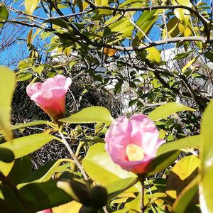 椿、ピンク💓 下の椿は白ワビスケです💙 下の左が、ミツマタです。💚 枝が、三つに別れています。 まだ、蕾で白いですが、花が開くと黄色くなり、とても良い香りがします。🍀💗