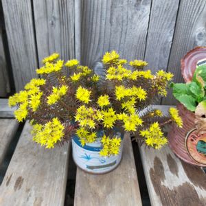 セダム・ チョコレートボール、黄色い花が咲き出しました😃寒い冬を越えて咲いてくれるのはありがたいです✨ 黄色いつるはゴールデンハニーサックル。これも寒さに強いです。赤い葉ものはコプロスマ。冬にパンジーと一緒に植えてあったのを再利用しました☺