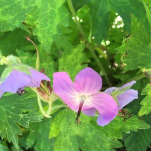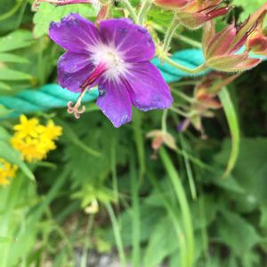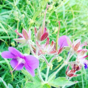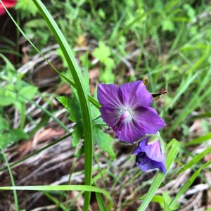 ゲラニウムの仲間? GSユーザーの山彦蝶様に教えて頂きました。 「タカネグンナイフウロ」 フウロソウ科 日本固有種 草丈40~50㎝位、 花径2.5~3㎝のフウロソウです。 ムギセンノウに隠れて咲いています。