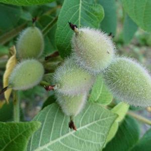 川辺の土手に生えてました。 通るたびに実が膨らんでいて、 まるで梅の実のように丸っこく、鈴なりになってます。 気になって実を触ったところ、指がベタつきました。