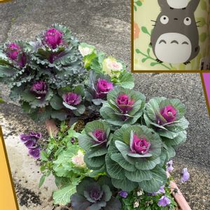 ①葉牡丹の寄せ植え プランターに植えました すき間はビオラがモリモリになったらいいなぁ ②〜④ロウバイ(蝋梅)葉の陰で咲いていました。 🏷️毎月16日はトトロの日 🏷️月曜日にビタミンカラー