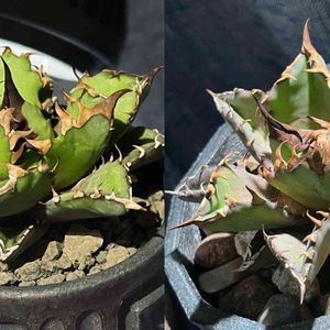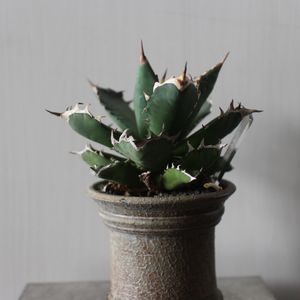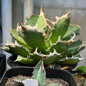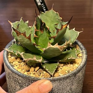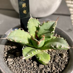 アガベ チタノタ 姫巌龍ちゃんです 根っこはみ出しやらかしてたので…… 少し時期早いですが、3号から3号ロングへの鉢サイズアップ植え替えしました。 誤差かな……