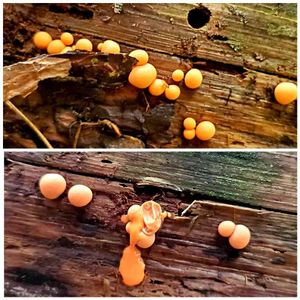 朝活散歩道にて 倒木の切り株に… オレンジ色のツブツブさん。 3ミリ~5ミリメートル丸くて小粒 小枝でツンツンしたら以外とヤワラカイよ😅 もっと強く…プチっと破れオレンジ色の液体が… イクラみたい… 🔍👓👆は🍄では無いらしい 変形菌(粘菌)マメホコリの仲間(ドロホコリ)? この世界は🍄以上に奥深そうです。