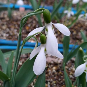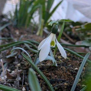 スノードロップ ガランサスエルウィシー ヒューケラ、ゼラニウム、アジュガなどが入っている基本放置寄植えの隅に、昨年秋にスノードロップの球根を4個植え付けしました。 それが最近咲いてきました。3個は花が見られそうです。小さい花姿で乱暴に扱うと、直ぐに花が落ちそうな華奢な感じです😍