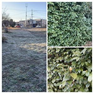 おはようございます😃 今朝の散歩です。 大好きな近くの小さな果樹園。 すっかり霜が降りて、地面は真っ白です。 横の旧家の垣根は一部分が珍しい椿の垣根です。 今はまだ蕾です。 しかし、探したら一輪咲いていました。 どこにあるのかわからないでしょう。 この椿は白い小輪から中輪、初嵐と思われます。 初嵐には白玉と嵯峨と呼ばれる花があって、これは嵯峨だと思います。 咲き揃うととても美しいです。 その頃にまた投稿したいと思います。