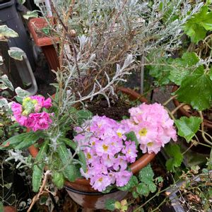 おはようございます😊 ストックピンクとプリムラジュリアンフリルのピンクと薄紫をエレモフィラとミニバラ に寄せ植えしました💕