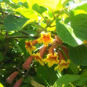 行ったことない道を歩くのは楽しいな〜 坂道の途中から南国になった〜 なんですかこの太陽がよく似合う花は⁉️ ✉️Gさんからカレーバインと教えていただきました!釣鐘蔓、ノウゼンカズラ科、カレー臭がする!今度嗅いできます👃 ありがとうございました😄