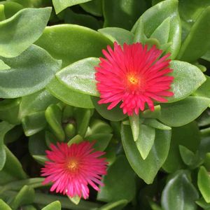 ❤️ハナツルソウ ハマミズナ科 メセンブリアンテマ属 明るいピンクから紫がかった花が葉腋(葉の付け根のまたになった部分)につき日中に開く 多肉質の小さな葉は、卵形かハート形で2枚が対になって生えており、微細な乳頭状の突起に覆われているそうです