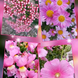 おはようございます✨ ピンク色のお花をコラージュしてみました。 ↖ライスフラワー↗マーガレット ↙キンギョソウ↘タチアオイ 5月14日、6月1日(タチアオイ)撮影