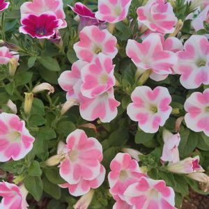 おはようございます😊 庭に咲く花🌼 ①去年のこぼれ種百日草(ジニア) ②サフィニアももいろはーと ③サフィニアあずきフラッペ ④サフィニアアンティーク色 ⑤サフィニア 名無しさん