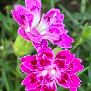ナデシコ(八重咲き) 花言葉 純粋な愛 半額で買った小さな苗ですが 地植えしたらいつの間にか 花が咲き始めました❣️🌸🌸✨ 他の植物の中に埋もれて 存在を忘れていたので💦 咲いてくれて嬉しいです❣️😆♫