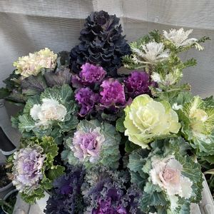 おはようございます😊 葉牡丹の寄せ植え🥰 いつもなら他のお花と寄せ植えするのですが以前お店で葉牡丹だけの寄せ植えを見て今年は葉牡丹だけで寄せ植えしてみました❣️ 後ろの3つ(2,3,4枚目)はちょっとだけいい苗、後はひとポット100円とかひとポットに4〜5本の苗とか。。 高低差を出すのにちょっと苦労しましたがなんとか形になったかな😂 今週もよろしくお願いします🎶💕
