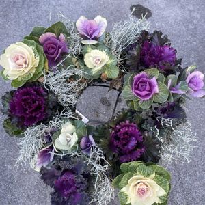 おはようございます😊 葉牡丹リース💜🤍 ご近所さんが職場の人から葉牡丹の苗をたくさんもらって帰ってきたのでいくつかどうぞ〜😄といただきました。 葉牡丹だけではさみしいのでプラチーナを買ってきて先日upした葉牡丹の寄せ植えでいくつか余った葉牡丹をプラス。。 置く場所をどうするか考えて。。 ちょうど支柱型のソーラーライトがリングの真ん中に入ったのでソーラーライトの足元に置きました🎶 早いもので今年も後2週間。。 今週もよろしくお願いします🎶💕