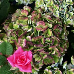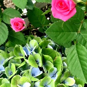 ミニバラが咲いてくれました💕 お気にりのアジサイと🌹 アジサイが少し赤くなってきました😊