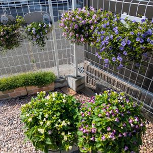 PWスーパートレニアカタリーナ 今年絶対に育てたくてお迎えした植物🌿 連日雨に打たれても、元気に顔を上げてくれる健気で強健な三姉妹🎀👸👸👸🎀 ①今年の新色 アイスリバー 鉢をひっくり返すなどハプニングがあったのに、こんなにキレイに咲いてくれました🥹✨🤍 ②ピンク🩷リバー 夏でも涼やかなピンク、でもウチのは何だか紫寄りのピンク ③ブルーリバー💙💜 アメジストと悩みに悩んで、半透明がかったこの色を。 (…でも、先日HCの割引デーに出会い、アメジストさんお迎えしちゃいました😅) ブルーリバーを真ん中に、両脇にアイスリバーとピンクリバーを置いています。 ④アイスリバー側から📱✨ ⑤ピンクリバー側から📱✨ もっと垂れさせたいのですが、何だかついつい✂️していたせいで、梅雨入りしてしまい。 溢れるように咲かせたいなぁ💪✨ 梅雨明けをじっと待とう。