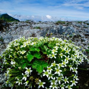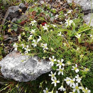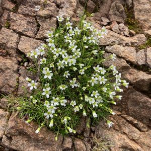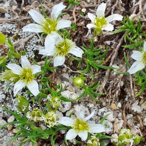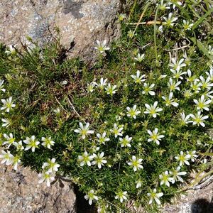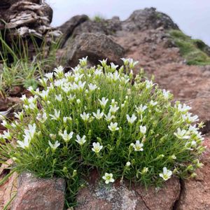 タカネツメクサ(高嶺爪草) ナデシコ科 岩の間から密集して小さな可憐な花たちが競うように咲いてました🤍 「爪草」とは、細い葉を鳥の爪に見立てた表現です。花は茎の先に咲きます。花弁は長だ円形で先は丸く、半透明のすじが3本あり、また花弁の形には幅、長さなどの変異も見られます。茎は多く分枝するので大きな株になり、針状で長さ8~15mmの葉は密生しています。 *駒ヶ岳高山植物図鑑より
