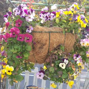 【ビオラのハンギング】 沢山咲いてきました❣️ 『ときめきスミレ プレミアム』💜 『君待ち』🤎 『ときめきビオラ オレンジボム』💛 『ときめきビオラ シナモンフィグ』🩷