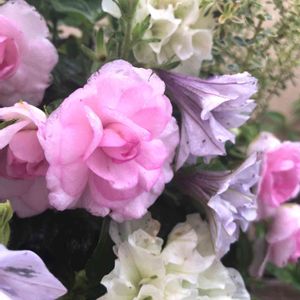 おはようございます✨ 今朝も☔️模様お日様☀️が恋しいですね💦 ちょっと寂しげなハンギングのお花達🌼🌸 インパチェンスカリフォルニアローズ🌸 八重咲きペチュニア💠