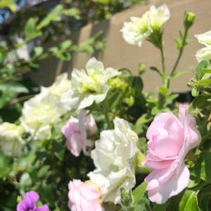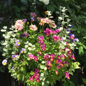 ハンギングのお花さん達🌸🌼お日様☀️浴びて元気良く輝いています💕✨ 八重咲きペチュニア🌼 カリブラコア💠 インパチェンスカリフォルニアローズ🌸