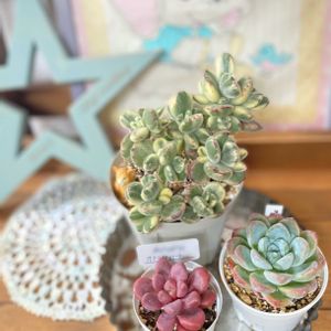 曇り空☁️☁️湿気は嫌ですね😌 翠雲錦とOMオブツーサ錦です! 清涼感を求めた🌨️🧋錦の日 3枚目と4枚目は同じOMオブ錦ですが、4枚目の去年の10月投稿と比べて、斑まわりが変わってきました!