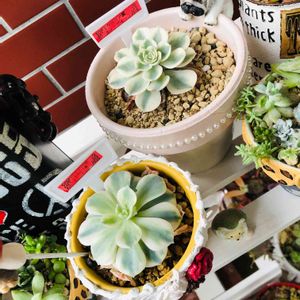 🌸✨みらい様主催24日は錦の日✨🌸 第一回参加させてください❀.(*´ω`*)❀. 「錦」でも「班入り」でもOK❣️とのこと🍀 金の成る木の班入り🍀買ったばっか 多肉永遠様のサブセシリス錦🍀 ドキドキで買ったチビのサンバースト🍀 バックダンサー?葉牡丹の寄せ植え(笑)