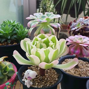 おはようございます ☀️ 🪴アエオニウム雨花石(うかせき) 園芸店で見つけて夏でも綺麗なので 秋まで待てずに購入 🙂↕️ 雨花石=白鵬錦=リバーストーン 同じ物みたいですね 😗 前からある白鵬錦(上)とは色合いが 違っていてこれからが楽しみです 👍 pic3,室内管理のアエオニウムたち 👀 🏷️錦の日 🏷️斑入り見つけ隊♪ 🏷️2のつく日は斑入りの日