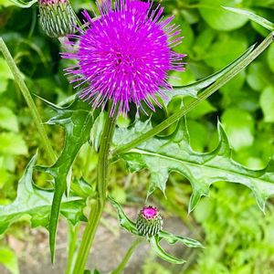 野の花 アザミ💜 花言葉…独立 報復 厳格など スコットランドの国歌 原産地…日本など北半球 ※草むらに咲くアザミの花の色味に 心惹かれます。茎はかたく、葉はギザギ ザで何をも寄せ付けない印象です。 ギリシャ神話、スコットランド逸話にも 登場するようですね。
