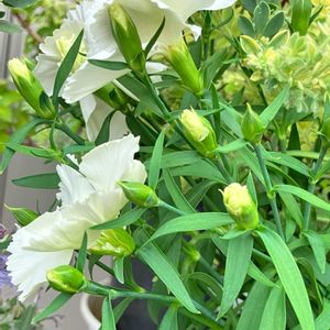 まだまだ開ききらずに 狭い寄せ植えの中で 悶え来る白いカーネーション🌸 [今日のお花]🌼カーネーション