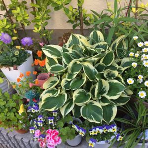 斑入りギボウシ綺麗な葉がいっぱい出てきました。 鉢で育ててます。秋になると葉無くなりますのでそのまま別の場所で放置し、春になって新葉が出て来たらお披露目と毎年大活躍です。多分10年以上はこの状態を繰り返してると思います。手間いらずで存在感もあります。