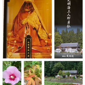 今週は、主人が単身赴任している山形県へ来て居ます。 『巌龍山 蔵髙院 光明海状人即身仏』 へ一人でお詣りに行って来ました。 現在全国で約16体の即身仏が確認されていますが、そのうち10体が出羽三山の1つ湯殿山に祀られ即身仏のメッカと言われる程だそうです。 光明海上人は江戸時代に入定した即身仏調査として全国で初めてであり、「100年経ったら掘り起こしてくれ」と遺言したという地元の伝承に基づき、新潟大学医学部の元で石室を発掘及び学術調査され、安置されたものです。 お線香を上げ手を合わせると、、、 大飢饉で苦しむ人々を救うために寄り添い、木喰行や断食をし漆を飲み、、、 一心に祈願して修行した姿を思うと涙が目に溜まりました。 漆を飲むのは腐敗を防ぐためだそうです。 今もなお、コロナ禍で苦しむ世を見守り寄り添って下さっているような気がしました。 勿論、撮影は不可です。 ➖写真はパンフレットより➖