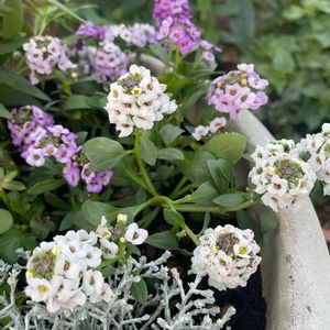 白とラベンダー色で元気いっぱいのアリッサム。手前のシルバーブッシュと一緒に、寄せ植えに可愛くおさまりました♪
