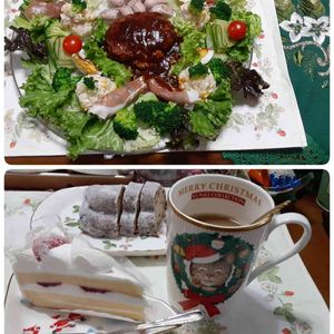 メリークリスマス🎄🎅🎁✨ その2 ヨシケイの食材をアレンジ。 最近はコロナで買い物をなるべくしないでやっています。 買い物は週一回。 夕食はヨシケイを上手く使ってプラスワンで作り主人が好き嫌いが多いのでやりくりしてます。 今日は胡瓜でリボンを作りクリスマス用にしました。 ケーキも一人でいただきました😋🍴💕