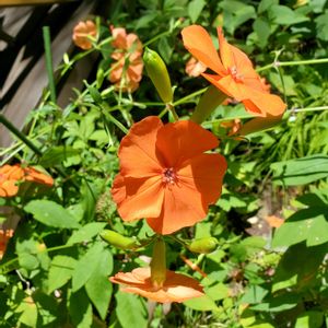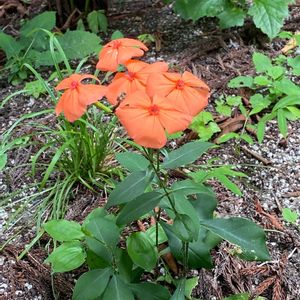 庭の彼方此方で 朱色の花が日陰を好んで咲いている 西瓜の為に張ったネットも 丁度良いと涼んでいる様で 私もちょっと🤏仲間入り 夏の山野草も グリーンに朱はよく映える🌿🏵️☘️🏵️🍀 暑い夏休みの 涼し気な一時… 節黒仙翁🏵️🌿