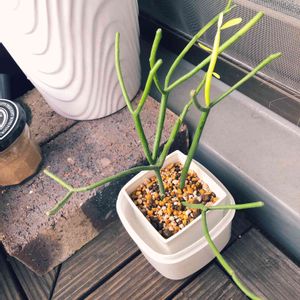 ミルクブッシュ 親株からチョチョッと剪定して 水差ししてたものが発根したので 今日から鉢植えにして 腰水にしてます🌱🌱🌱 最初にミルクブッシュ買った時は 変わり種だなぁと大して 気に入ったわけでもない感じだったのに 最近はミルクブッシュ見る度に なんてオシャレで 可愛いヤツなんだろう😋って すっかりお気に入りの一つに、、、 そのことを いつも行くグリーンショップの お兄さんに話したら、、、 ミルクブッシュのような 棒状の植物が好きになり始めたら いよいよ植物好きの 最初の一線を越えた証拠 これが加速すると 今度はニッチを極めた? ユーフォルビア系の 葉も茎も花も分からんような形した 植物が好きになっていくよ それが植物好きの最終形態🤖 、、、だそうです🤣 ちなみにそのグリーンショップの棚は だんだんお兄さん(店長)の 趣味が反映しすぎな ニッチもサッチも言えない品種が 増えてきてます🤣 どんな店目指してんだって感じ🤣 私はまだそこまではないけれど こうやって棒状の植物を 増やそうとしてる、、、 最終形態、、、???笑