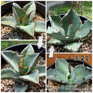 アガベ・チタノタ アガベ・シュリベイマグナ 5/2、園芸店に大量入荷していたアガベの小苗の中から2種類に絞り、肉厚なチタノタの短葉のシュリベイマグナを購入しました。 個体差があったので大量の中から選ぶの楽しかったです。 アガベらしく葉が展開してきてかわいい😊