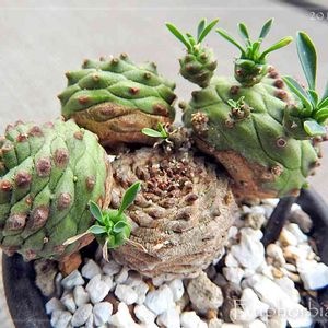 オベサブロウなどに比べて、(たぶん)あんまり見かけないユーフォルビアの交配種。それとも、名前がはっきり決まってないから検索に引っかからないだけ? オベサと鉄甲丸の交配種じゃないかなーと思っているけど、どうだろう? 去年から育てているけど、去年はほとんど成長しなかった。今年は、植替えしたら子吹きして子株が大きくなった。 この子株が採れやすいのが困るんだよなー。