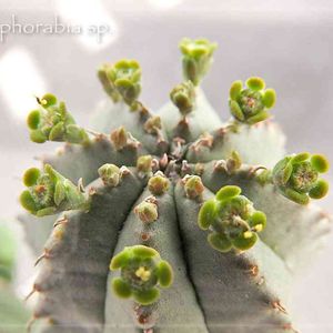 くわしい名前が不明のユーフォルビア。この花のようすは、オベサよりはホリダに似てるかなー? 花粉が見えるので雄花、雄株だ。