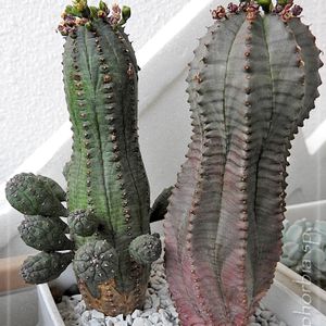 個人的には魔紅キリンかなーと思う、正体不明のユーフォルビアsp. ちょうど一年前の写真があったので一年間の成長を比較してみました。 去年は一気にたくさん子吹きしたけど、今年は新たな子吹きはなし。その分子株も、親株も大きくなりました。愛嬌のある姿になって来てうれしい♪